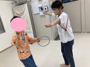 動く木にお友だちがフープを掛けていきます。手の枝をよーく見て「エイッ」と