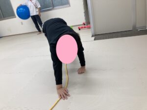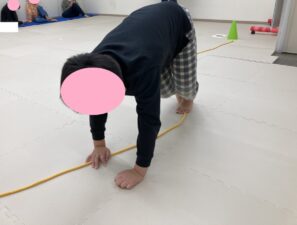 手の平を広げ、足はつま先立ちでロープの上を四つん這いで歩きます。