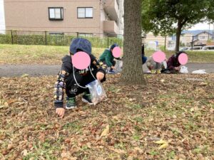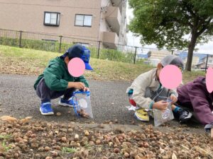 早速、どんぐりの木の下で どんぐりを拾うお友だち😊