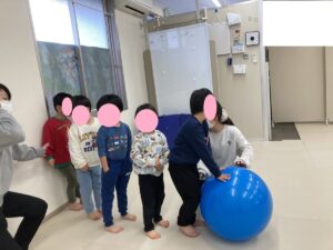 大きなボールの後ろに1列に並んでいるお友だちたち・・・