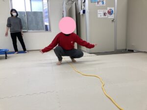 アヒル歩きです。腰を低く落とし、しゃがみ姿勢で前に進みます。簡単そうに見えてとても難しい動きなのです。