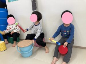 みんな張り切ってピアノと歌に合わせて太鼓と鈴、カスタネットで上手にリズムを取って