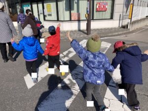 横断歩道を渡る時に自然と手がピッと上がるお友だちたち!
