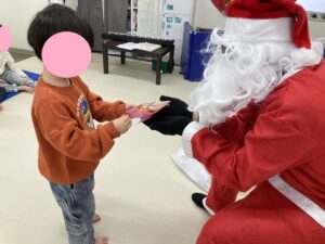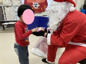 名前を呼ばれるとニコニコ笑顔でサンタさんの前に立ち、大きな声で「ありがとう!」と言って受け取るお友だち✨