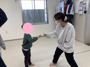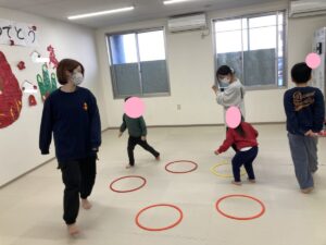 教室の中ではフープ取りゲームをお友だちとスタッフと一緒に行いました。