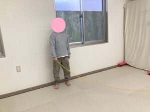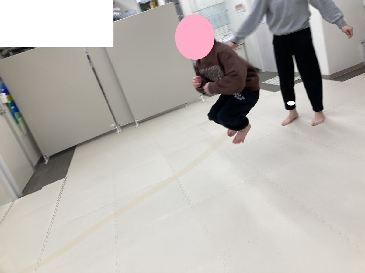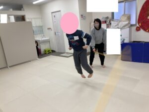 お友だちとスタッフと「はい!はい!」と声を掛け合いながらタイミングを合わせ縄の中に入り込みます。タイミングが合うと連続ジャンプが続きますよ👏✨