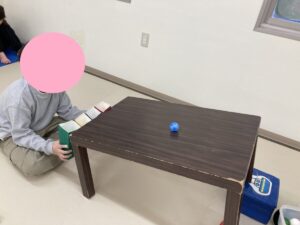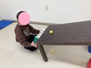 スタッフが傾斜のついた机で色のついたピンポン玉を転がします。お友だちはピンポン玉と同じ色の牛乳パックでキャッチします!