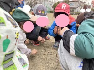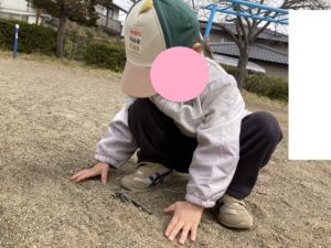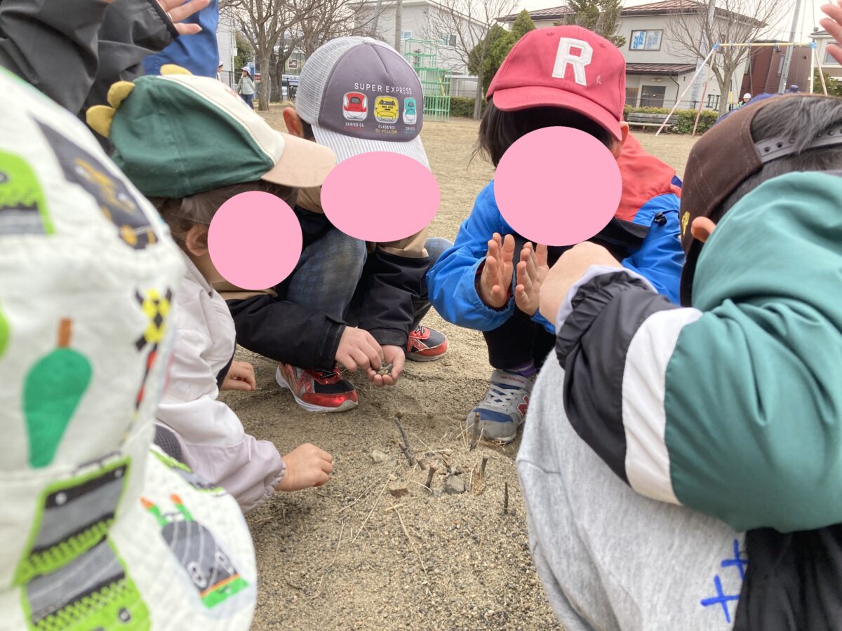 「ぼくは木の枝集めるね」「じゃあ、ぼくは石あつめてくるね」と分担をしケーキの材料集めをしていました😶🧡