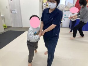 お友だちとスタッフと手を繋ぎピアノのリズムに合わせてスキップをします。