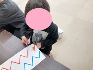 ハサミ・・紙の持ち方も安定し綺麗に切る事が出来ています。