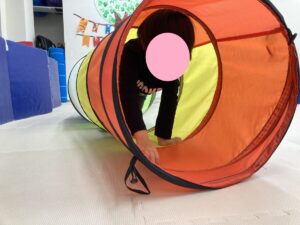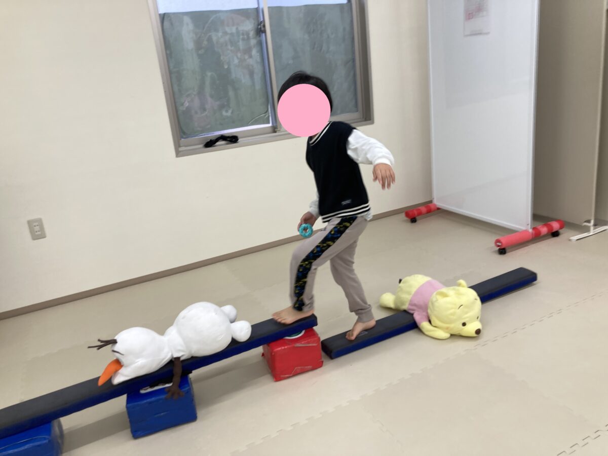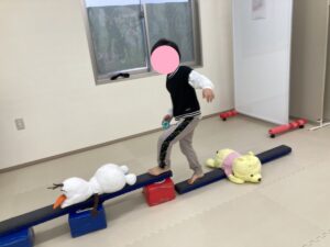 平均台の上に置いてあるぬいぐるみを踏まない様に歩いていきます。