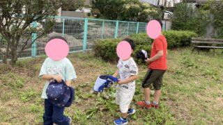 午前中の涼しい時間、裏の広場に遊びに行きました。朝から「バッタをつかまえたい」と楽しみにしていたお友だち。さっそくバッタ探し開始です。「みてートンボが飛んでるよ~」「黄色いトンボだね~」「幼虫がいる」などなどお友だちの楽しそうな声があちこち...